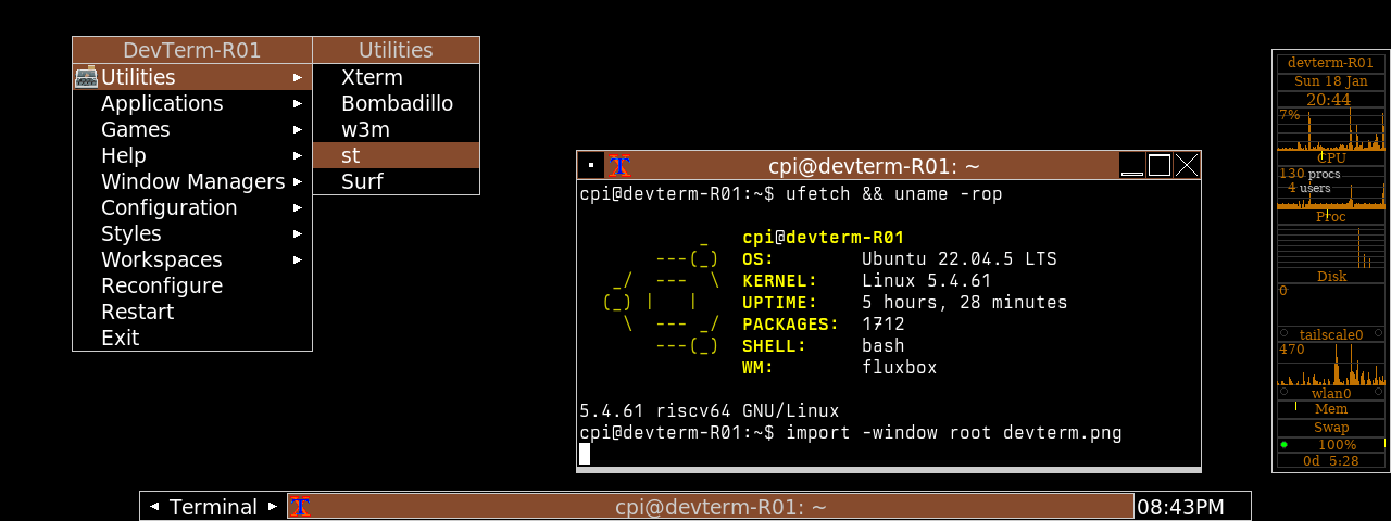 fluxbox on Ubuntu captured about 2 months ago, uploaded by ecliptik about 2 months ago | Download Notes: Clockwork DevTerm R-01 running a custom Fluxbox theme with Berkeley Mono terminal font. GKrellM, ufetch, xterm