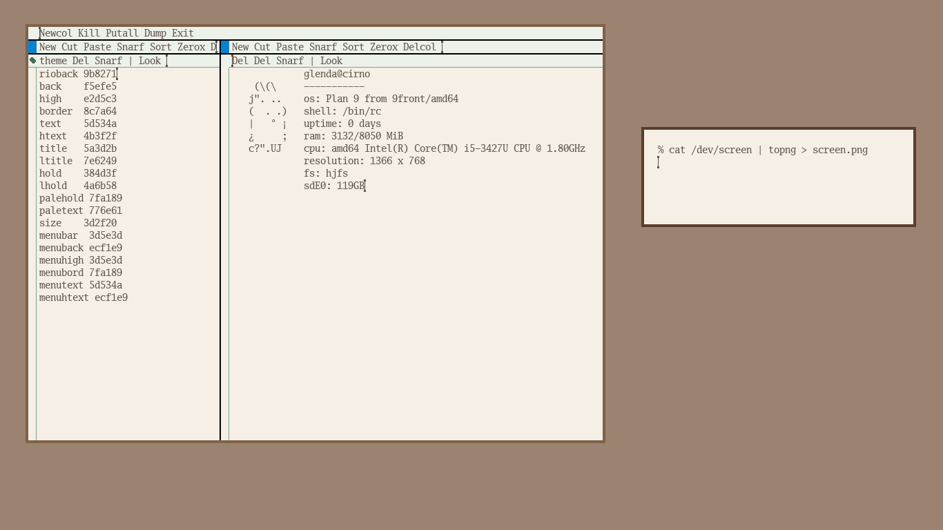 rio on 9front captured about 10 months ago, uploaded by dalem about 7 months ago | Download Notes: modified source. Acme, window Dotfiles: https://blog.dalem.foo/posts/2025/06/13/0/