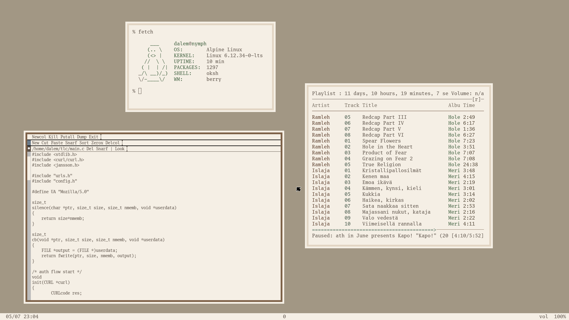 berry on Alpine captured about 7 months ago, uploaded by dalem about 7 months ago | Download Acme, lemonbar-xft, ncmpcpp, ufetch