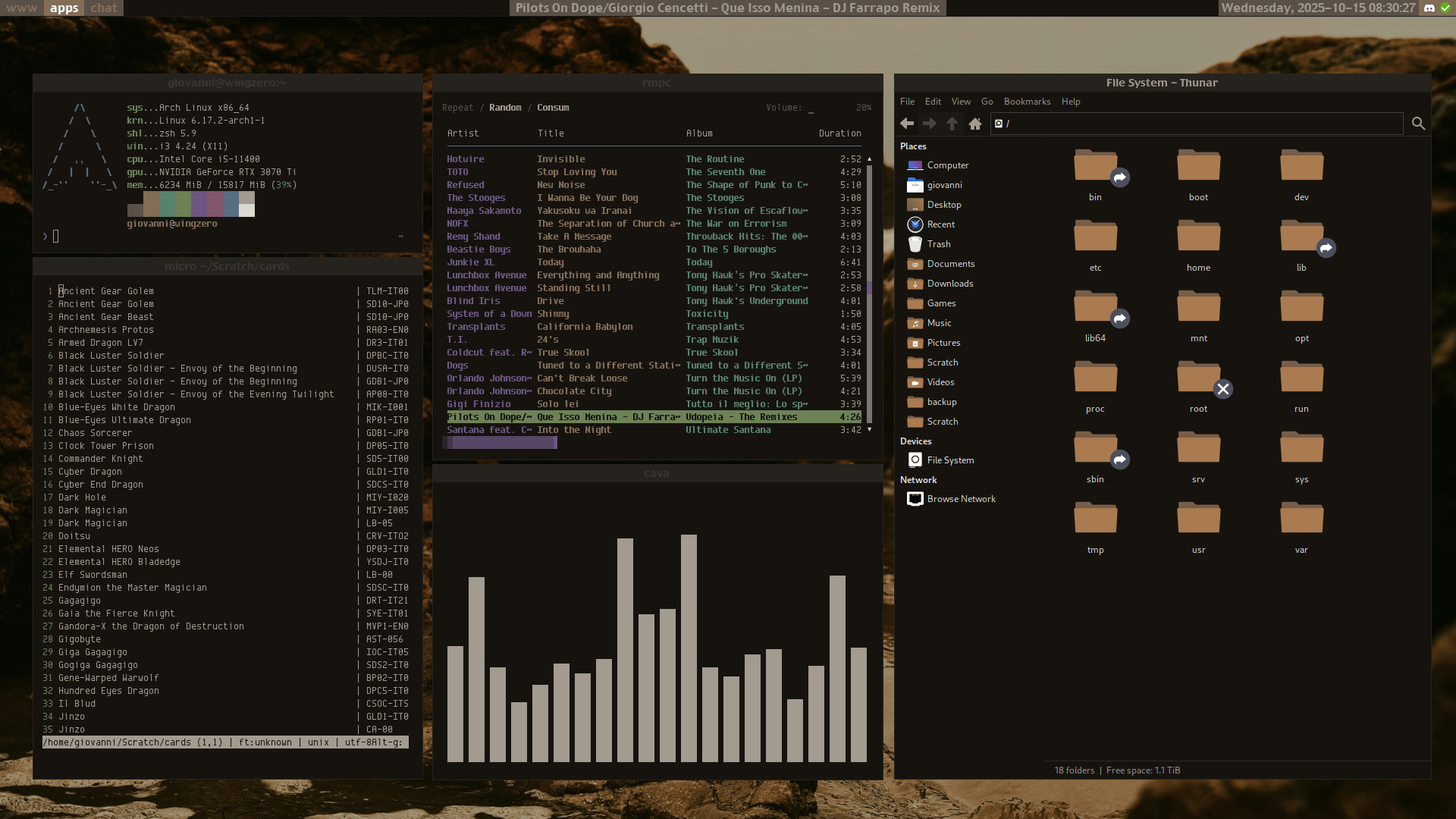 i3 on Arch captured and uploaded by giovanni about 3 months ago | Download alacritty, cava, Micro, Polybar, rmpc, thunar